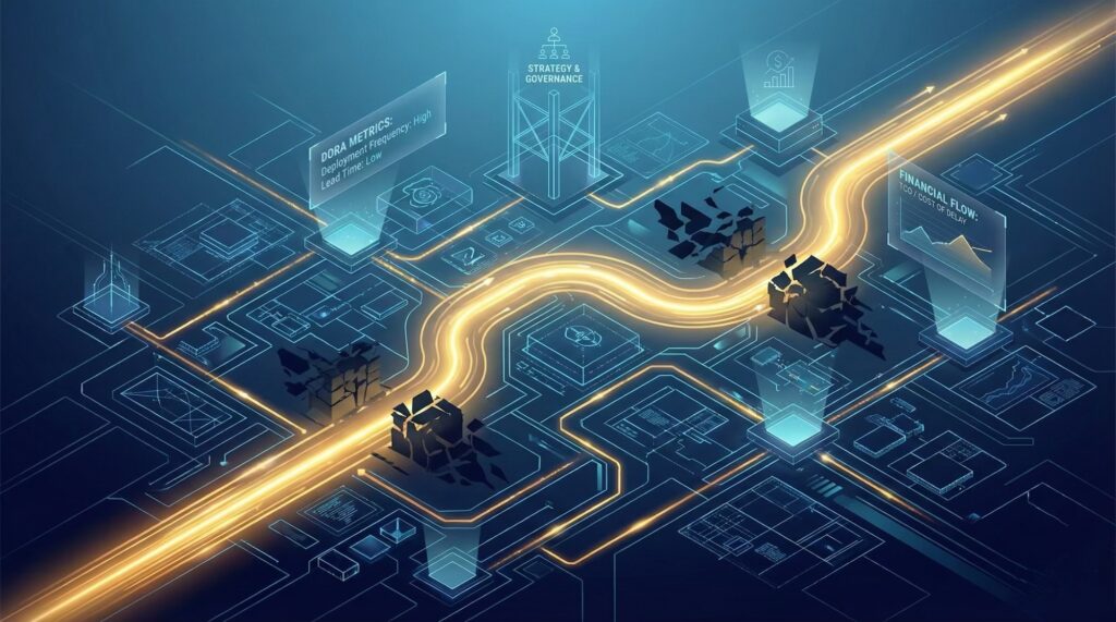 A comprehensive terminology reference organized by domain: Strategy, SAFe, DORA Metrics, Technical Architecture, and Organizational Dynamics. Perfect for interviews and daily workflow.